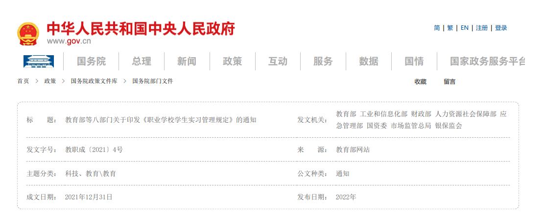 教育部等八部门关于印发《职业学校学生实习管理规定》的通知