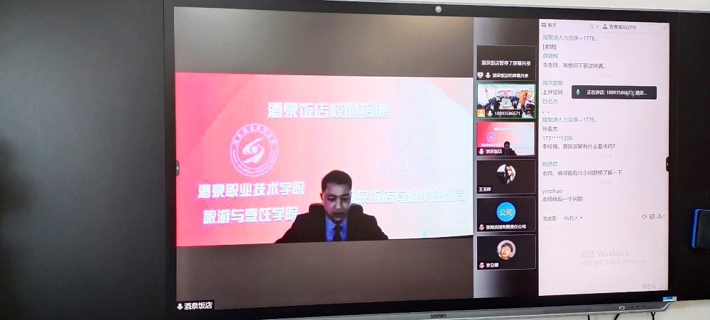 敦煌文旅集团、阿克塞文旅集团、酒泉饭店、张掖宾馆、玉门阳光酒店等企业分别进行线上宣讲,向同学们详细介绍了酒店的基本情况及岗位需求情况,并与同学们开展交流互动,就工资待遇、年假调休、晋升通道、发展空间、保险保障等问题为同学们答疑解惑。