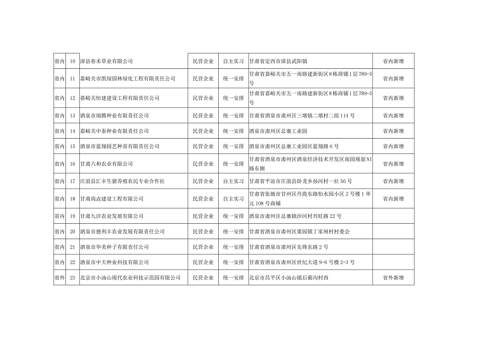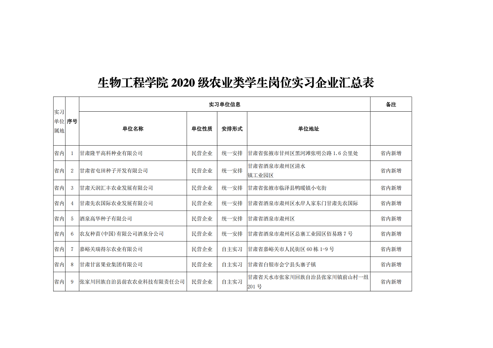 根据教育部等八部门《职业学校学生实习管理规定)》(教职成[2021] 4号)和甘肃省教育厅等八部门关于《甘肃省职业学校学生实习管实施细则》要求,经学校党委会议审议通过,生物工程学院2020级统一安排的24家实习单位和经学生自主申请的6家实习单位(共计30家)均符合《职业学校学生实习管理规定》相关要求。现予以公示(详见附件),接受社会监督。