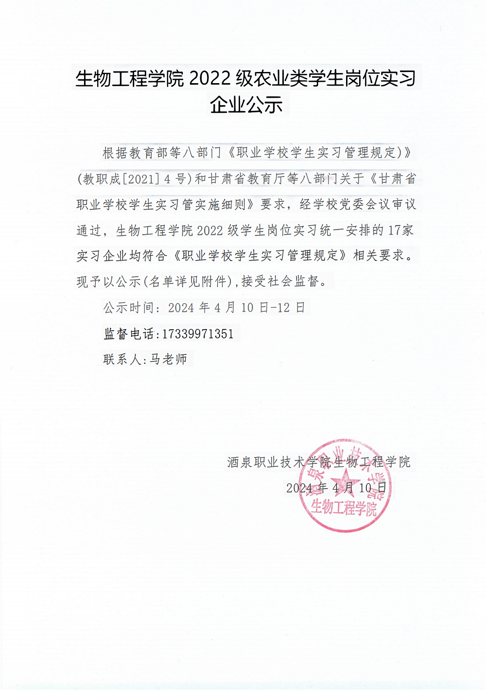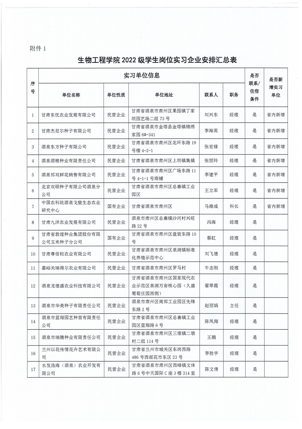 生物工程学院2022级农业类学生岗位实习企业公示