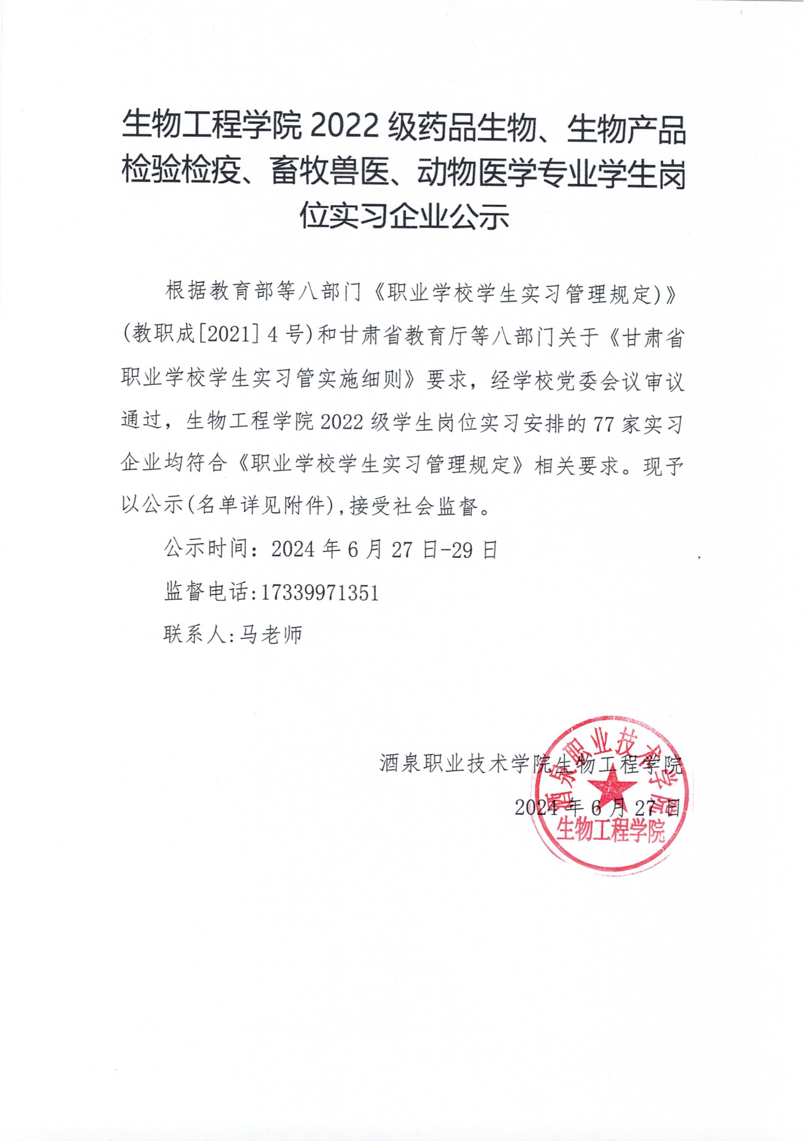 生物工程学院 2022 级药品生物、生物产品检验检疫、畜牧兽医、动物医学专业学生岗位实习企业公示