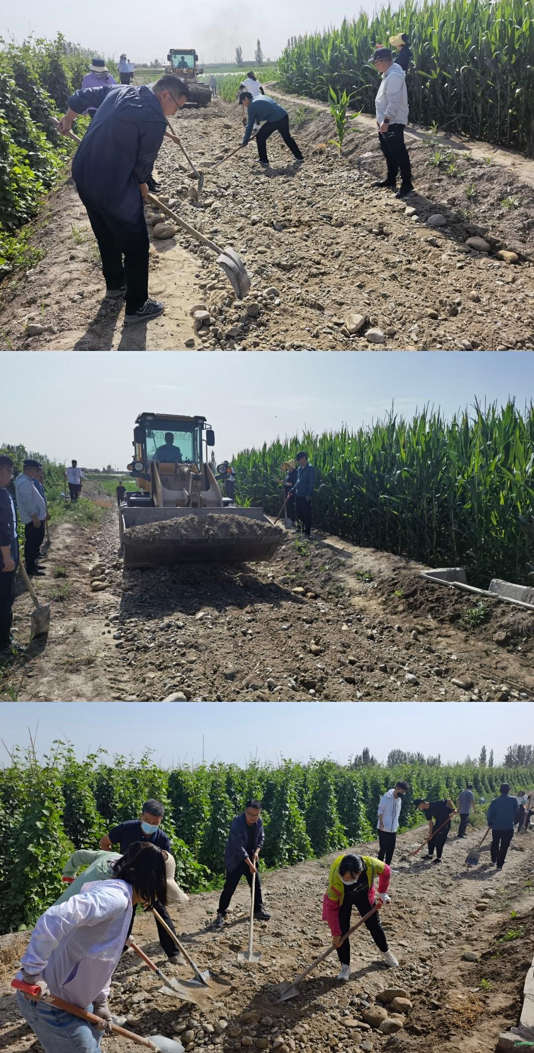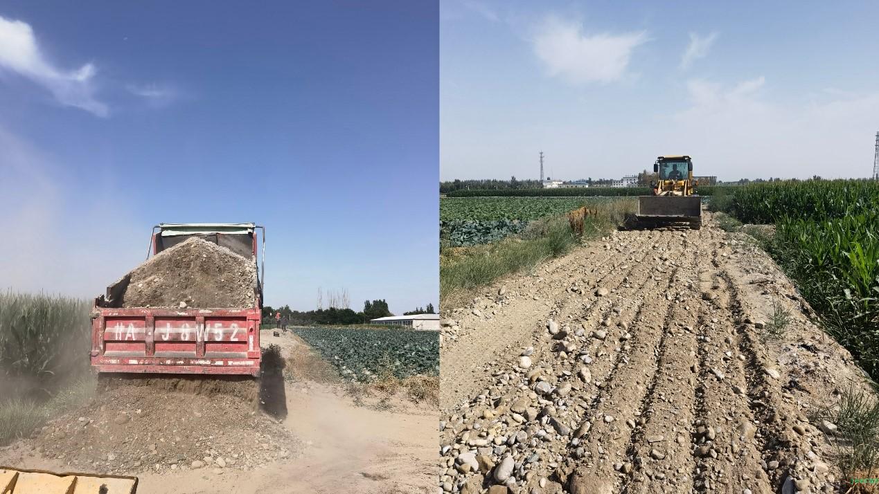 上午九时许,在党支部书记田政锋同志的带领下,学院全体教师积极行动,会同果园镇小坝沟村委会相关领导,共同前往施工现场。首先党支部书记田政锋同志与村委委员商议协调田间生产道路铺筑工程标准及工作量,随后协调铲车、翻斗车等机械拉运沙石铺筑路面,在施工现场,田政锋同志亲自指挥,挥动铁锹,带领大家按施工标准精细化施工。烈日炎炎、骄阳似火,老师们丝毫没有半分畏惧,不顾炎热与疲劳,马不停蹄地埋头苦干,筑路机械往来穿梭,大家有条不紊地开展各项工作,呈现出一派繁忙的建设景象。