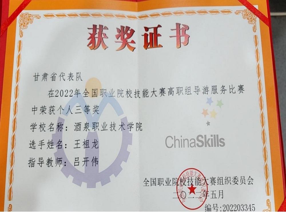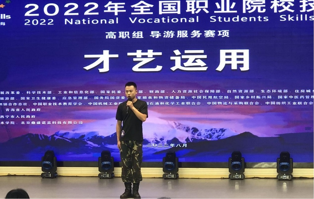 8月5日,2022年全国职业院校技能大赛高职组导游服务赛项在青海省西宁市西宁城市职业技术学院落下帷幕,我校旅游与烹饪学院2020级旅游管理专业王祖龙同学取得三等奖的好成绩。