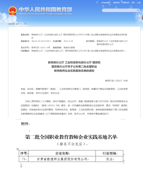 日前,教育部办公厅、工业和信息化部办公厅、国务院国资委办公厅联合印发了《关于公布第二批全国职业教育教师企业实践基地名单的通知》,正式公布了第二批全国职业教育教师企业实践基地名单。在目前所有认定批中,甘肃省敦煌种业集团股份有限公司是唯一一家甘肃入选的农业领域企业!
