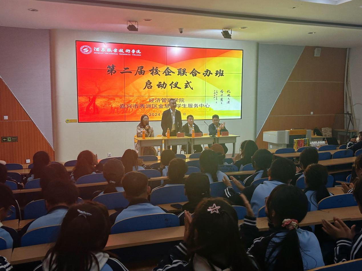 为深化产教融合、校企合作,推动人才培养与就业有效衔接,促进校企协同发展、互惠共赢,10月16日晚,我院与嘉兴市秀洲区金慧大学生社会工作服务中心及其优质企业代表在行知楼报告厅联合举办第二届校企合作订单班启动仪式。经管学院副院长苏芸芸、嘉兴市秀洲区金鹏大学生社会工作服务中心副主任樊鹏奋、饶忠斌,嘉兴中润光学科技股份有限公司人事行政副部长吴丹飞出席仪式,经济管理学院2023级350名学生参加本次开班仪式并进行互动交流。