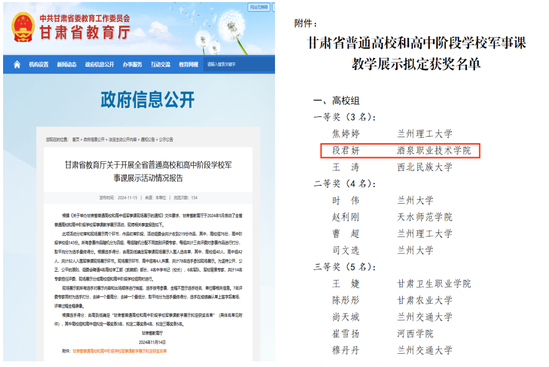 院系动态 > 正文教育与艺术学院教师段君妍荣获甘肃省普通高校和高中阶段学校军事课教学展示一等奖
