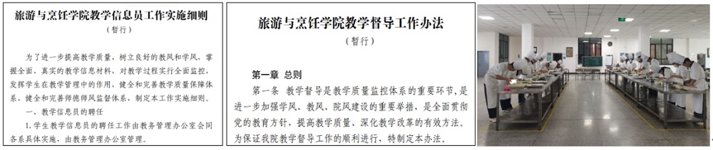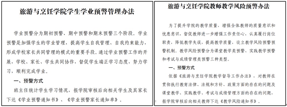 以目标绩效管理为抓手,以提升育人成效和管理提质增效为目标建立预警机制,从督导“问责”向“增效”转变。制定《旅游与烹饪学院教师教学风险预警办法》《旅游与烹饪学院学业预警管理办法》对督导中发现的问题实施常态性、周期性、专题性预警。促进浅表问题即时改,复杂问题持续改。提高了教师关注教学的责任,感调动教师了改进的积极性,同时鼓励学生学业质量整体提高。