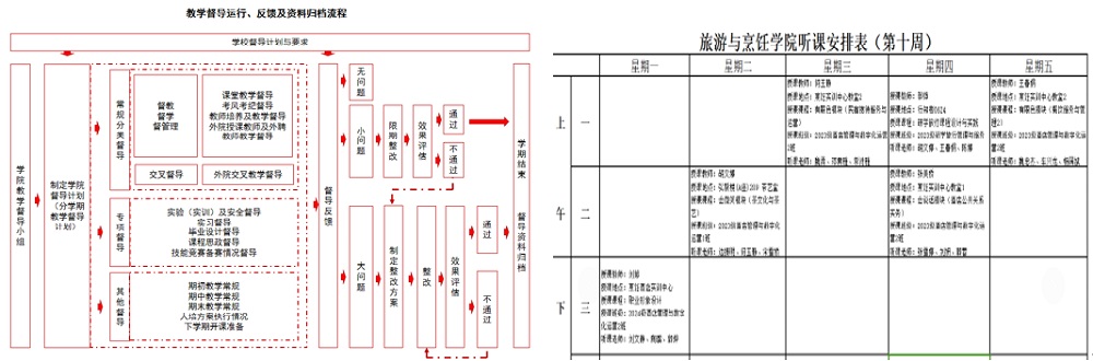 一是建立分类督导组织。建立以学院教学督导组为主,教师督导代表为辅,学生教学信息员和“学生院长助理”为补充的质量保证组织体系,强化教学质量监控顶层设计,推进督导评价分工负责、协同监控,充分尊重学生质量保证主体作用。二是完善督导评价考核体系。修订《旅游与烹饪学院教学督导工作办法》《学生教学信息员工作实施细则》,坚持定性考核与定量考核相结合,将督导工作成效与被督导对象对督导满意度相结合的教学督导评价与考核机制。三是完善督导评价应用体系。把教学督导的评价结果作为教师教学质量考核、评优评先的重要依据,纳入二级学院年度目标考核指标体系,强化督导评价应用,提升督导权威与成效。
