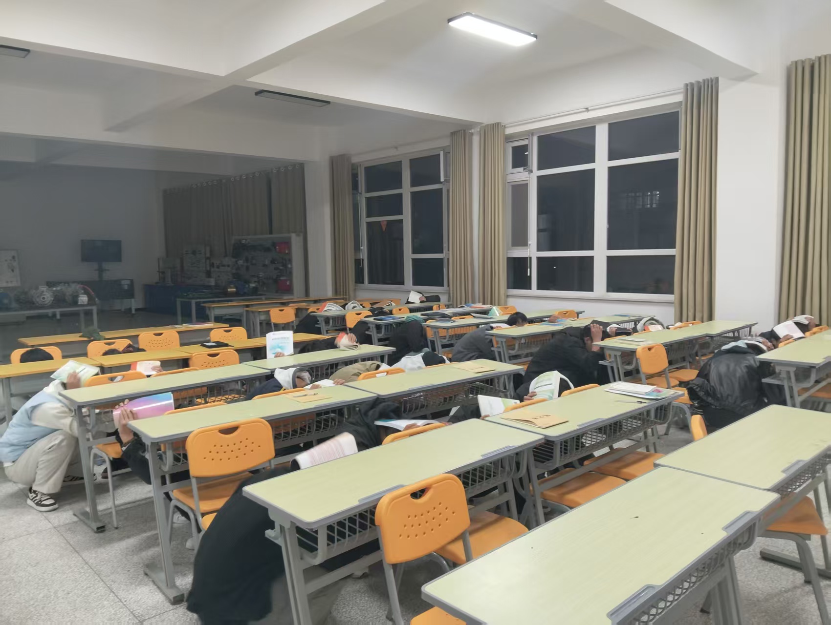 按照演练计划,21点10分,广播发出“现在地震来袭,紧急避震”的指令,格物楼内正在进行晚自习的学生迅速采取就近蹲伏于课桌下方、实验台旁或承重墙根墙角等避震措施。