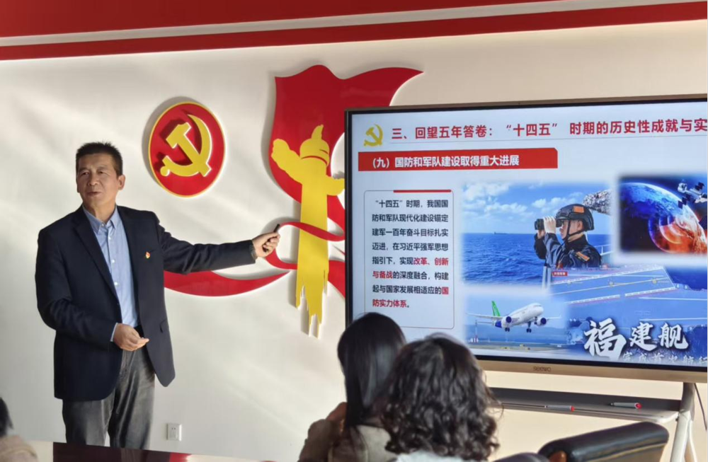 结合马克思主义学院学科特色与工作实际,聂峰同志从三个维度展开深入阐释:一是深刻把握中国式现代化的核心要义,强调“十五五”时期作为基本实现社会主义现代化的关键阶段,必须牢牢把握高质量发展首要任务,以科技自立自强引领新质生产力发展;二是精准领会全会精神的实践要求,指出要将“六个坚持”重要原则融入思政课教学改革、马克思主义理论研究等各项工作,推动理论阐释与时代需求同频共振;三是明确新时代马院人的使命担当,号召全体党员立足三尺讲台,把全会精神转化为课程思政的鲜活素材,在理论传播中强化思想引领力,在科研创新中服务国家发展大局。