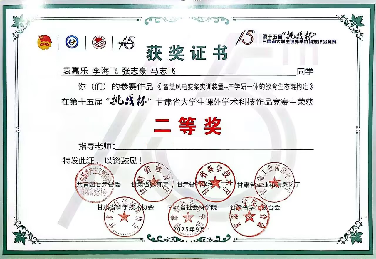 积极参与学校中国特色高水平高职学校和专业建设计划项目的申报与实施,聚焦“打造科教融汇新样板”重点任务,全面梳理重点实验室研究方向和科研资源,深度对接国家能源战略布局与地方产业升级需求,科学拟定了考核指标与详细经费预算,为项目立项与实施奠定了坚实基础。以科技赋能创新型人才培养,科研与教学协同育人,建成了集生产、教学、科研于一体的光伏储能石墨烯电热膜实验系统,为光伏工程技术专业模块化教学改革提供支持。建立学生进项目机制,首批新能源发电工程技术专业3名本科生、风力发电工程技术5名专科生参与教师科研项目。以科研项目为依托,积极参加各类创新创业项目和技能竞赛,获得中国大学生机械工程创新创意大赛二等奖1项,第十五届“挑战杯”甘肃省大学生课外学术科技作品竞赛二等奖1项、三等奖1项,第三届甘肃省大学生节能减排社会实践与科技竞赛二等奖1项、三等奖2项。
