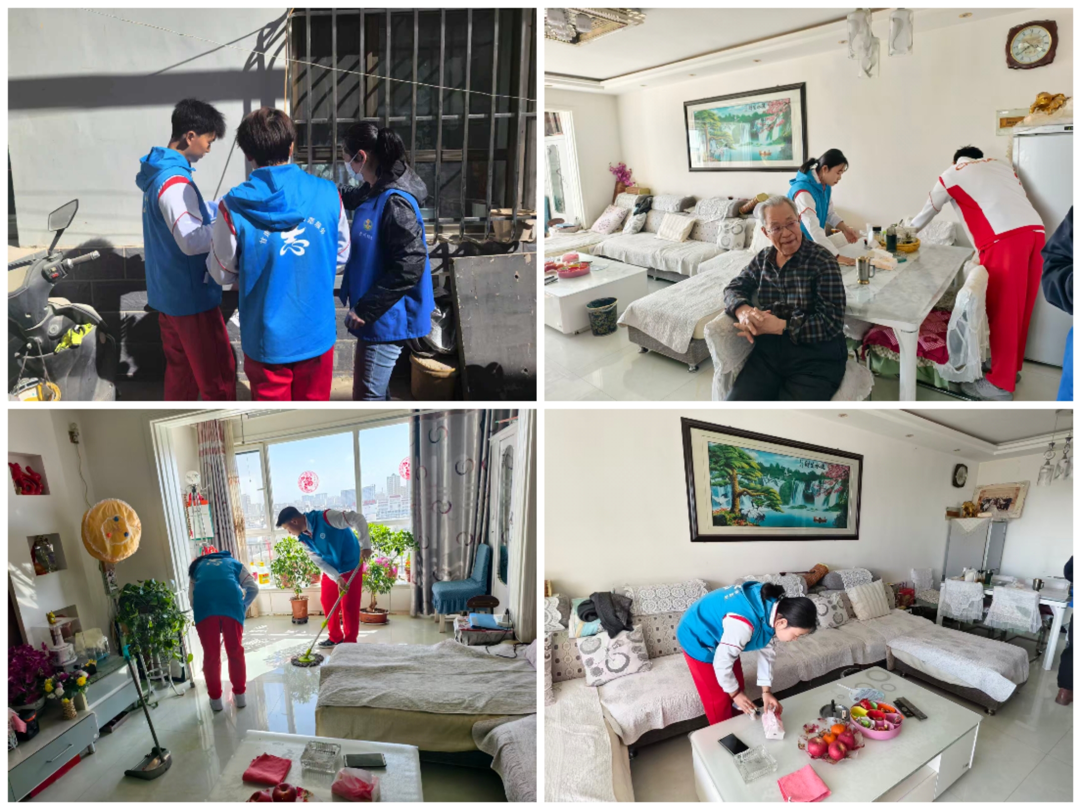 另一组志愿者则走进社区独居老人家中,携带清洁工具,认真打扫房间卫生、清理杂物、擦拭门窗,不放过任何卫生死角,同时耐心陪老人谈心交流,询问生活需求,用贴心陪伴驱散老人的孤独。