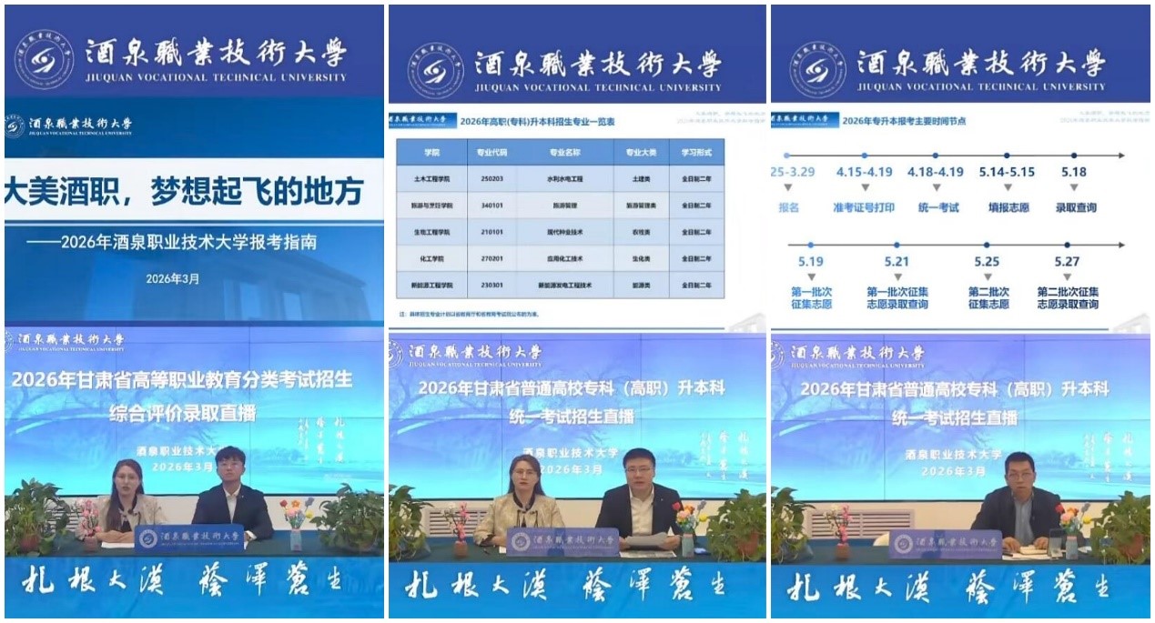 3月19日与3月26日,学校先后参加了甘肃省教育考试院组织的两场视频直播招生宣传活动。活动围绕2026年甘肃省高等职业教育分类考试招生综合评价录取和普通高校高职(专科)升本科两项招生工作展开,主要通过在线政策宣讲、互动交流、答疑解惑等形式,帮助广大考生精准掌握我校招生政策,深入了解学校的专业特色与培养方向。
