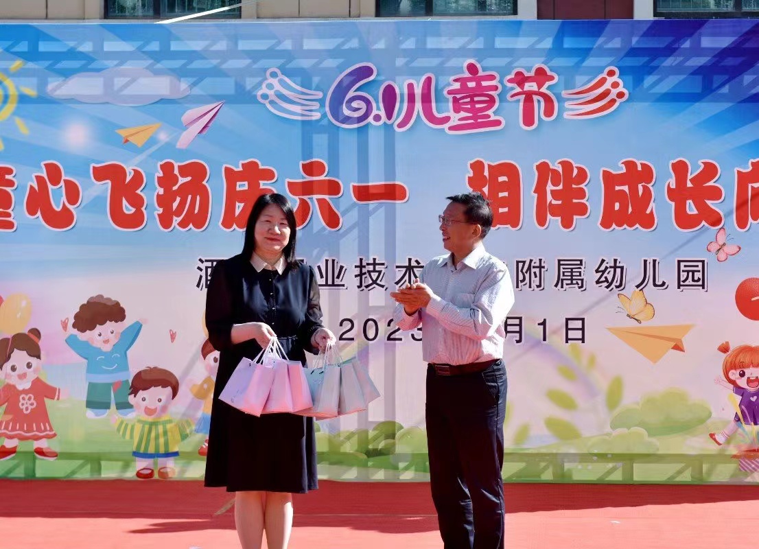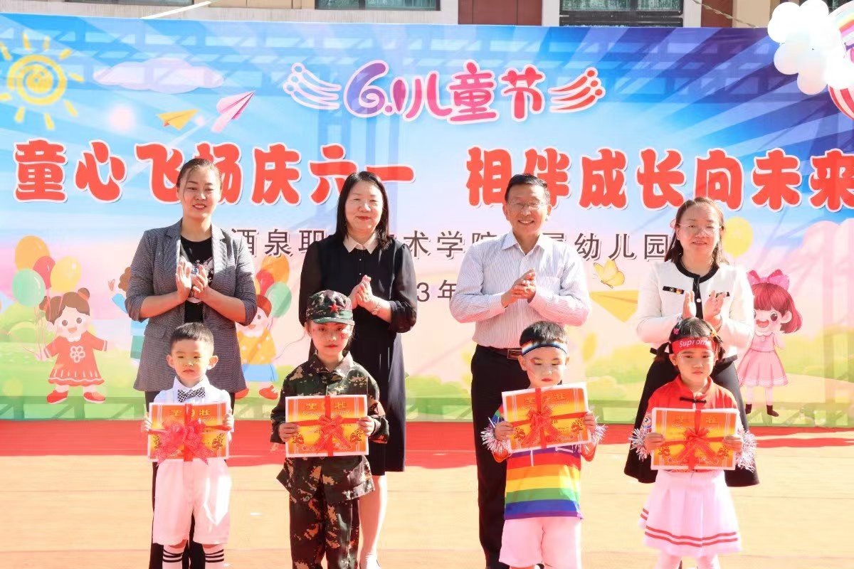 酒泉职业技术学院党委书记、校长易志军,教育与艺术学院副院长张冬琴、于芳出席本次活动。附属幼儿园园长张彩霞做庆“六一”献词,易志军代表酒泉职业技术学院党委致辞,为孩子们送来节日的祝福并为每位孩子带来节日的礼物。精彩的致辞和暖心的礼物对附属幼儿园的每位幼儿是一种莫大的鼓励,对教职工更是一种无形的鞭策和激励。为了让孩子在充满仪式感的活动中获得荣誉感和自信心,各班评选出了班级中的智慧宝宝、劳动小能手、运动小健将、阳光宝贝等荣誉称号,各班幼儿代表上台领奖,出席活动的领导向各班幼儿代表颁发了奖状。
