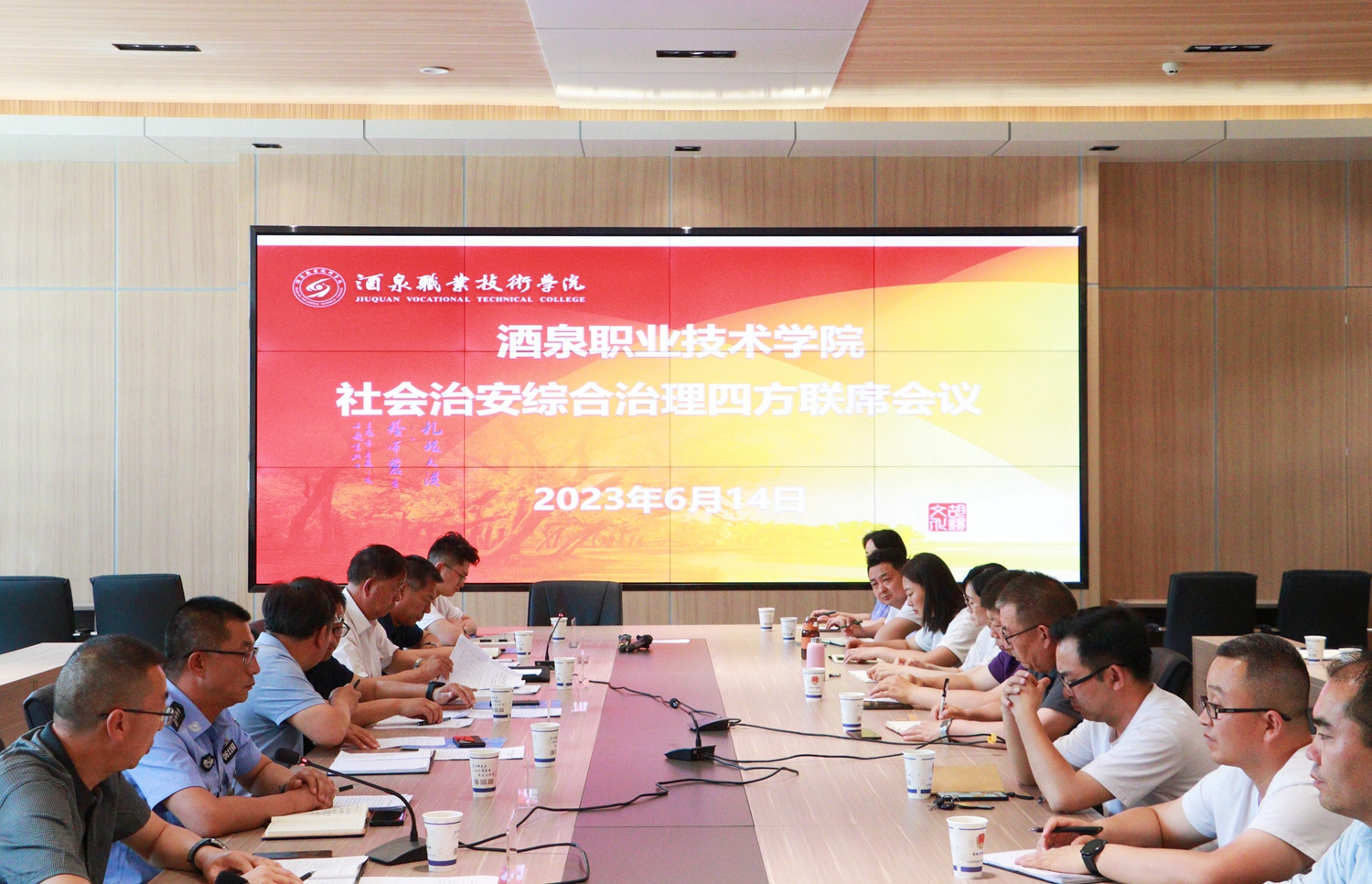 要闻快递 > 正文为进一步落实社会治安综合治理工作实效,有针对性地解决治安突出问题,切实维护安全稳定校园生态,6月14日下午,学校召开了2023年上半年社会治安综合治理多方联席会,解放路社区综治中心主任杨彦文、火车站派出所所长闫晓峰出席会议,学校党委委员、副校长施荣,酒泉卫校、工贸中专、附属幼儿园主管安全负责人及相关职能部门负责人,各学院主管学生安全工作副院长等参加会议。会议由应急安稳处处长王瑜珲主持。