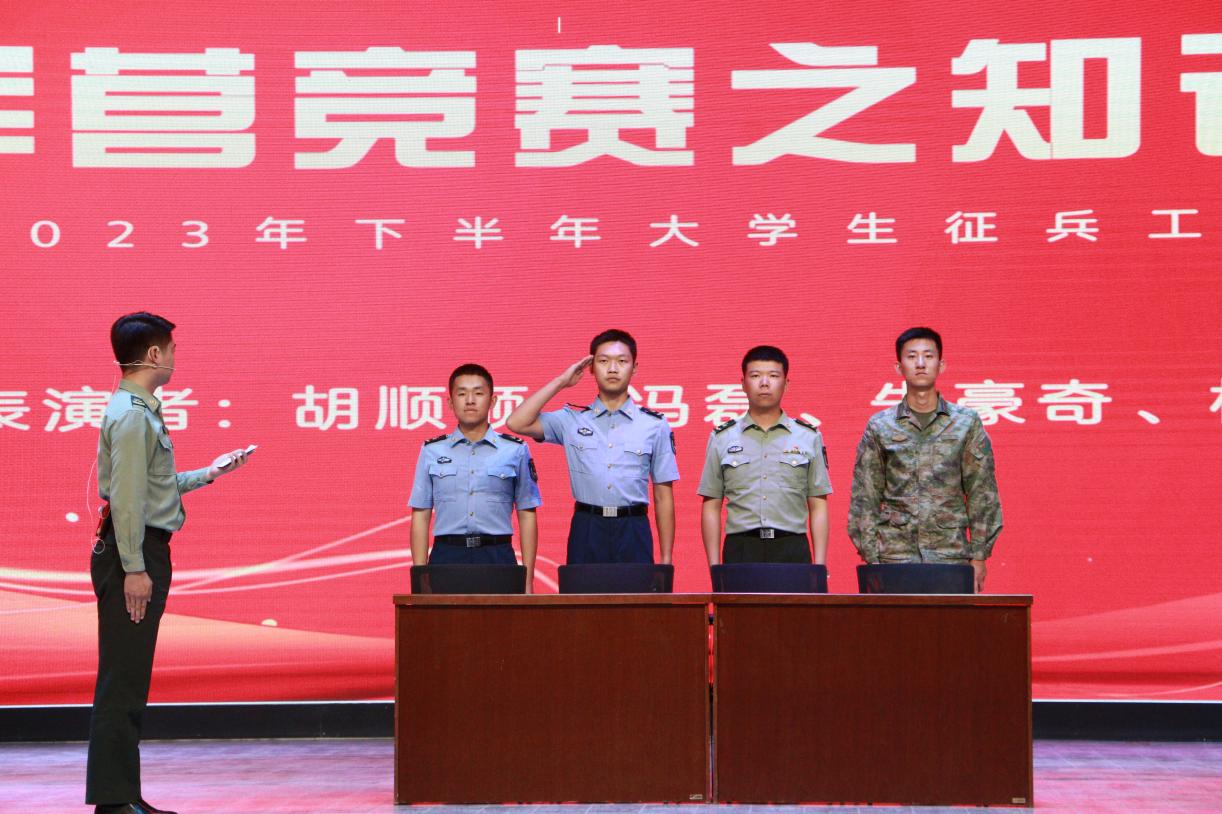 现役优秀大学生士兵代表胡顺顺、冯磊、朱豪奇、杨立杰、彭泉五名同志同台竞技,为大家带来《军营竞赛之知识大战》,竞赛内容涵盖《征集条件》、《优待政策》、《征集流程》、《甘十条》等,通过创新宣传形式,达到了以赛促学、以学促知、以知促行的宣传效果。