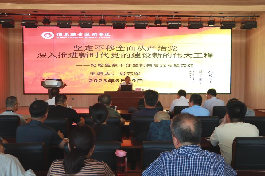 为全面贯彻习近平新时代中国特色社会主义思想主题教育,警示全体党员同志时刻保持清醒大脑,深刻理解认识全面从严治党的重要性,时刻坚持全面从严治党以更好地履行职责和使命。6月29日晚,学院党委书记、校长易志军同志为纪检监察干部、全体机关党员同志作题为《坚定不移全面从严治党,深入推进新时代党的建设新的伟大工程》的专题党课,党委委员、纪委书记、监察专员魏韡主持。