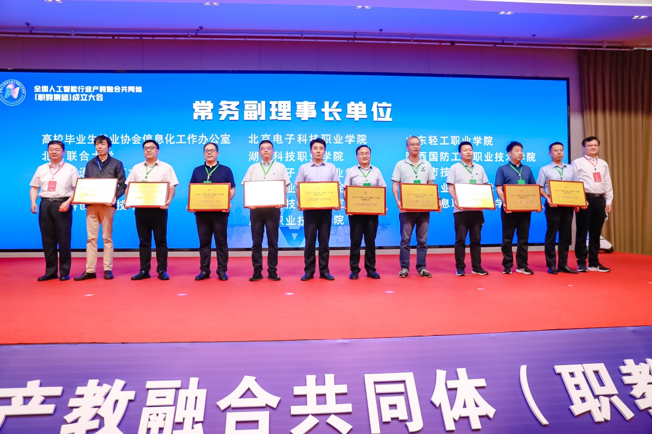 要闻快递 > 正文8月12至13日,由工业和信息化部教育与考试中心指导,百度(中国)有限公司、山东大学、东营职业学院主办的全国人工智能行业产教融合共同体(职教集团)成立大会在山东东营成功召开。工业和信息化部教育与考试中心主任郝志强、教育部职业教育与成人教育司院校发展处主任王宁、山东省教育厅副厅长张志刚、东营市人民政府副市长孙永、山东大学软件学院副院长刘士军、百度(中国)有限公司ACG教育行业解决方案总监戴海竹,东营职业学院党委书记杜振波出席会议并致辞。我校被推选为全国人工智能行业产教融合共同体(职教集团)常务副理事长单位,学校党委副书记许军当选为常务副理事长。