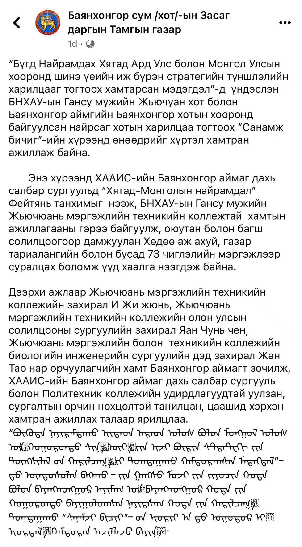 11月28日至11月29日巴彦洪格尔市嘎-恩赫巴雅尔市长陪同出访团出席了全部交流活动,在市政府他表达了对出访团的热烈欢迎、讲述了自己参加北京“一带一路”峰会的感受、介绍了巴彦洪格尔市落实《中华人民共和国甘肃省酒泉市与蒙古国巴彦洪格尔省巴彦洪格尔市建立友好城市关系意向书》的情况,重点说明了蒙方对实施飞天工坊项目和蒙古国到华留学生人才培养工作的支持举措。易志军首先对巴彦洪格尔市给予出访团的热情接待表示了衷心感谢,之后向嘎-恩赫巴雅尔市长等介绍了我校的基本情况、汇报了我校落实《中华人民共和国甘肃省酒泉市与蒙古国巴彦洪格尔省巴彦洪格尔市建立友好城市关系意向书》的总体情况。国际交流学院院长杨春骋就我校对蒙古国留学生培养暨飞天工坊项目前期准备工作情况进行了介绍。在蒙古国农业大学巴彦洪格尔分校,分校领导介绍了学校情况,表达了对双方建立友好学校和积极实施飞天工坊项目的信心和决心。易志军和分校校长签署了《酒泉职业技术学院和蒙古国农业大学巴彦洪格尔分校合作框架协议》,两校领导表示今后将在建立友好学校、学生的学历提升及研学交流、教师交流互访、教师硕博学历提升及其他领域开展合作交流。