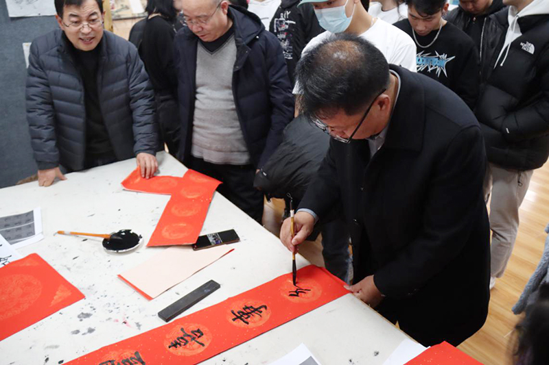 国际交流学院、马克思主义学院全体教职工观看了留学生书画作品,对留学生短时间内取得的书画成绩表示赞赏,副校长王金明现场为留学生展示了书法技巧,对留学生的书法进行了指导。