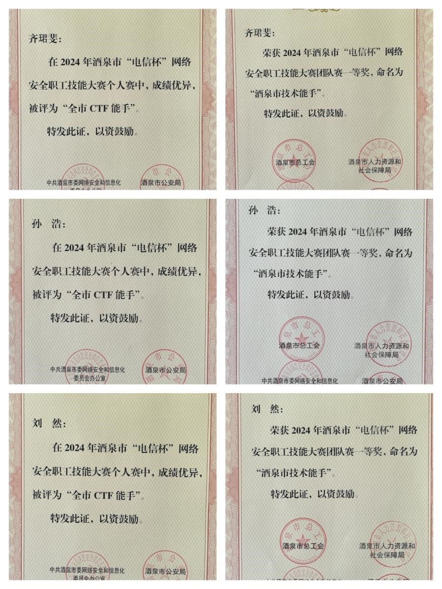 学校高度重视,迅速组织队伍精心演练,积极筹备,全面统筹规划,做好此次网络安全攻防演习的各项工作。本次活动分CTF夺旗赛和AWD攻防赛两个赛段进行。其中,CTF夺旗赛为个人赛,AWD攻防赛为团队赛。我校信息技术服务中心组建的团队在本次攻防演练活动中获团体一等奖。队员齐珺斐、孙浩、刘然秉持着“公正”、“公平”、“公开”的原则,发挥了顽强拼搏的精神,个人被评为"酒泉市技术能手"、"全市CTF能手"。