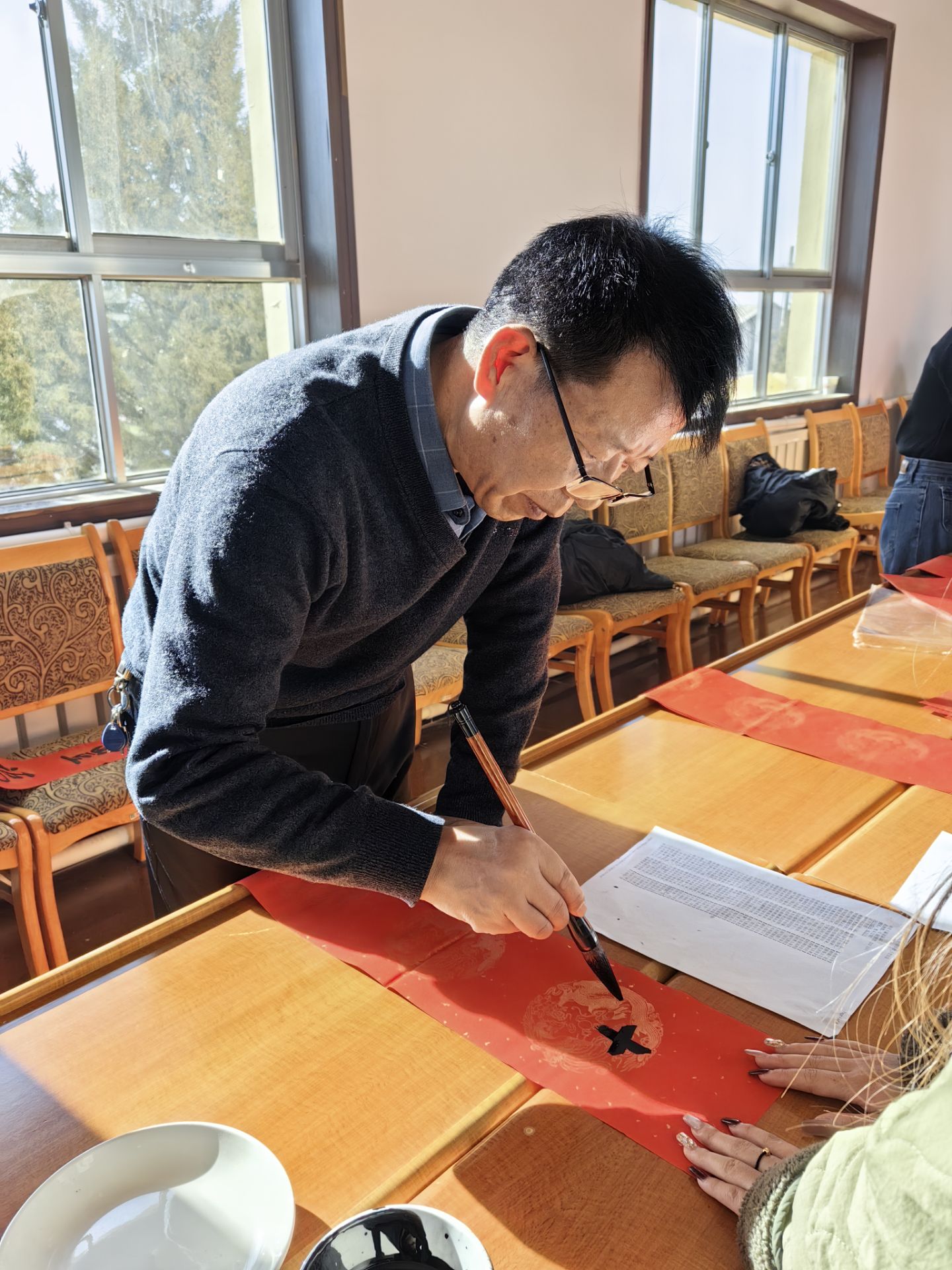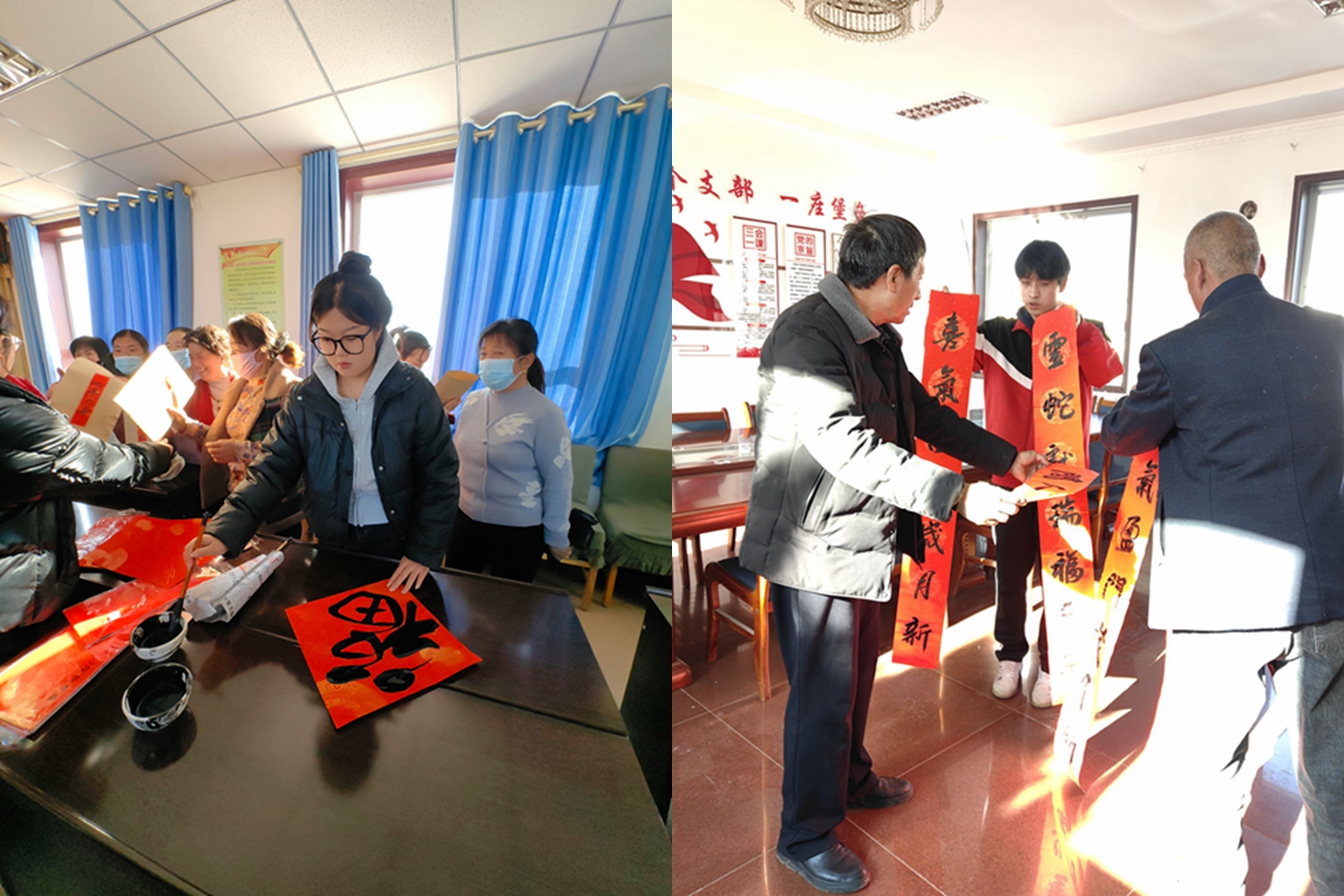 福赠春联祈平安,墨香暖心迎新年。2025年1月11日,学校党委委员、副校长王金明带领宣传统战部飞天书画院、教育与艺术学院、旅游与烹饪学院的老师们和学生志愿者先后赴帮扶点果园镇小坝沟村和丁家闸村为广大村民送上了新春的祝福与诚挚的问候。