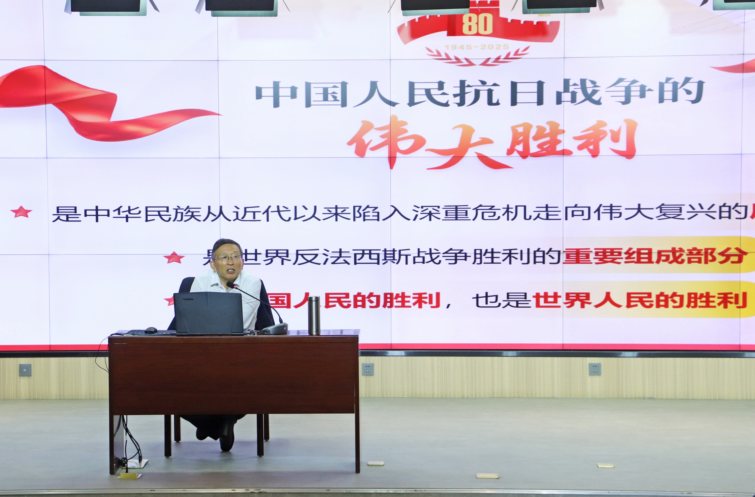 课堂上,易志军从“铭记历史,正义必胜”“民族壮举,浓墨重彩”“精神丰碑,永不磨灭”“珍爱和平,开创未来”四个方面展开授课。他以厚重的历史视野开篇,结合大量珍贵的历史资料与鲜活案例,生动再现了中国人民在抗日战争中浴血奋战的壮阔历程。他从“九一八事变”后的顽强抗争,到“七七事变”后的全民族觉醒,再到抗战胜利时的举国欢腾,系统梳理了中国人民抗日战争的历史脉络,深刻阐释了“正义必胜、和平必胜、人民必胜”的历史真理。同时,他立足新时代发展实际,对比抗战时期与当下中国的综合国力、国际地位变化,让同学们清晰认识到新时代党和国家事业取得的历史性成就,深刻理解中国式现代化建设的重大意义与光明前景。