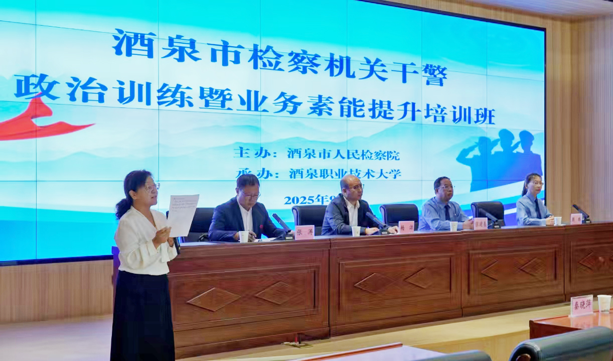 2025年9月15日,由酒泉市人民检察院主办、酒泉职业技术大学承办的酒泉市检察机关干警政治训练暨业务素能提升培训班在我校顺利开班。酒泉市人民检察院党组副书记、副检察长张建春,学校党委委员、副校长杨洁,酒泉市人民检察院党组成员、政治部主任周璐出席开班仪式。酒泉市人民检察院基层检察长、机关干警等近60名学员及酒泉职业技术大学相关领导老师参加开班仪式。