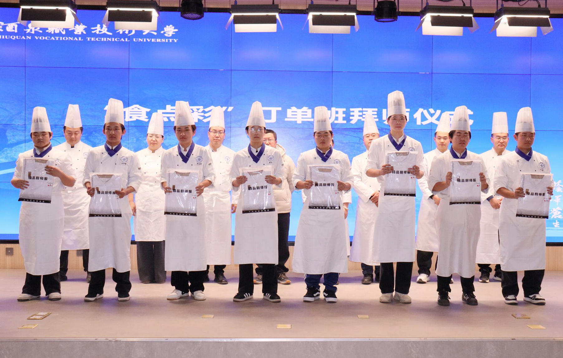 企业导师孙伟民、谢海蓉与校内导师边振明、杨国斌等 6 位专业教师组成导师团队,与刘云飞、宋锦轩等16名订单班学生正式结成师徒对子。一杯清茶、一份回礼,既延续了中华传统技艺传承的优良传统,也定格了校企携手培育人才的温暖瞬间,更承载着烹饪技艺“传帮带”的传承重任,彰显了校企协同培育匠心人才的初心。