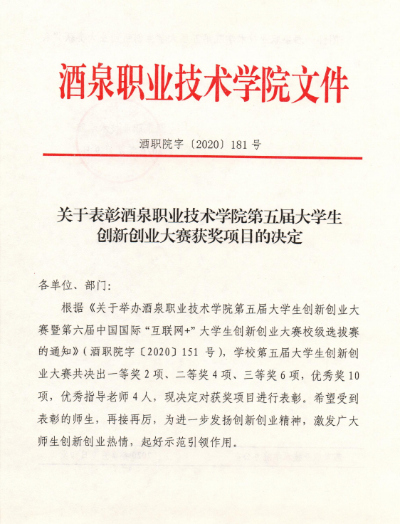 关于表彰酒泉职业技术学院第五届大学生创新创业大赛获奖项目的决定