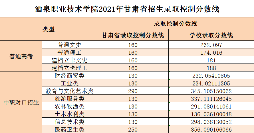 酒泉职业技术学院2021年甘肃省招生录取控制分数线