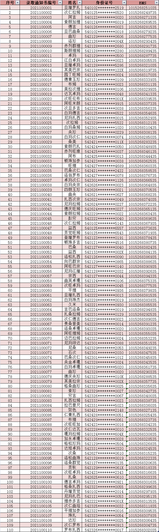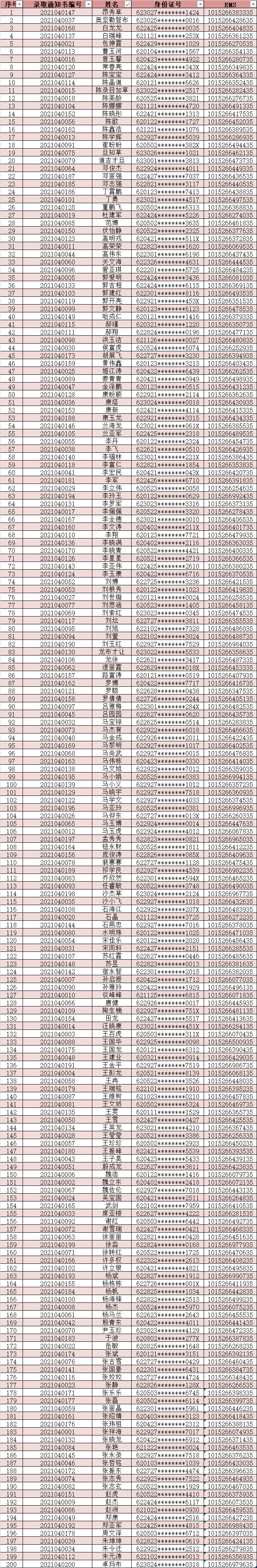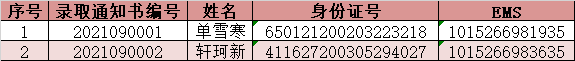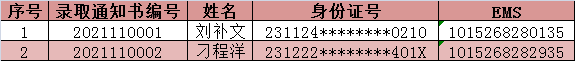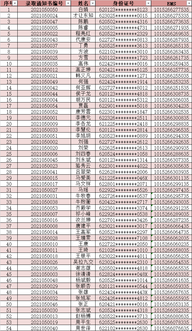 我校2021年中职对口升学、普通高考(甘肃、新疆)考生录取通知书已通过邮政EMS寄出,现将录取通知书EMS单号公布如下,请各位考生根据自己EMS单号通过邮政网站(https://www.kuaidi100.com/all/ems.shtml?from=openv)查询,如有疑问,请拨打:***********。