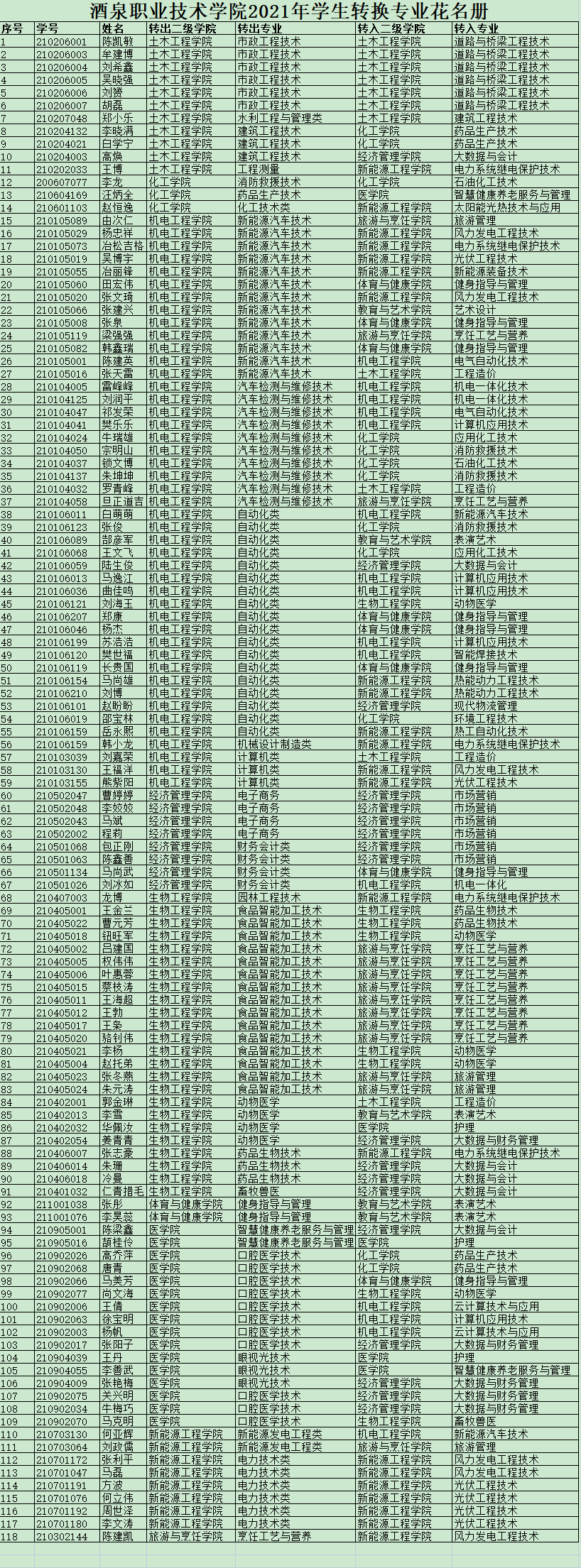 依据《酒泉职业技术学院2021年学生转换专业暂行规定》,经学生本人申请,二级学院和招生就业处审核,校长办公会审定,同意陈凯敏等118名同学转入新专业学习,现予以公示。若有异议,请在公示期内向相应部门反映。