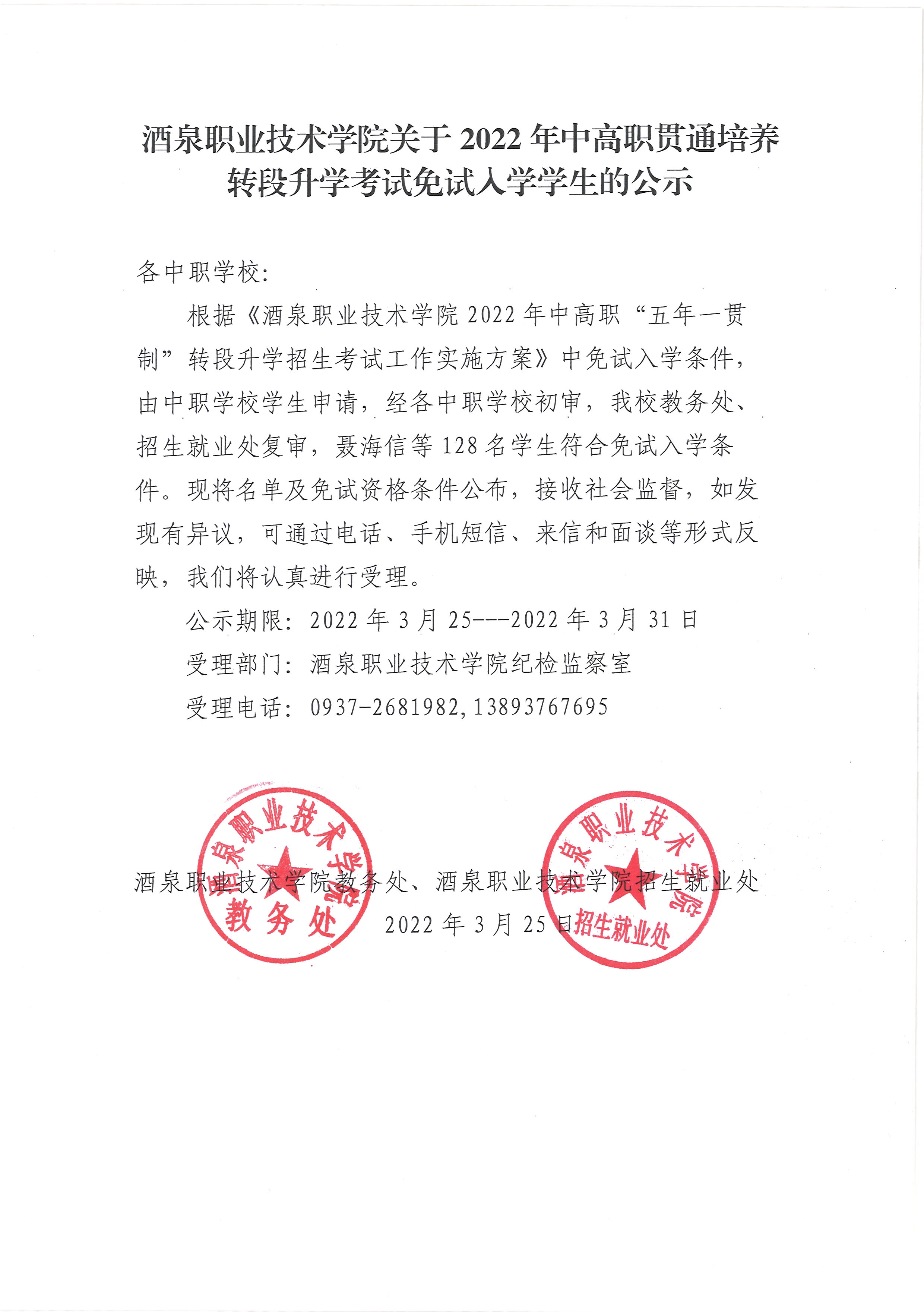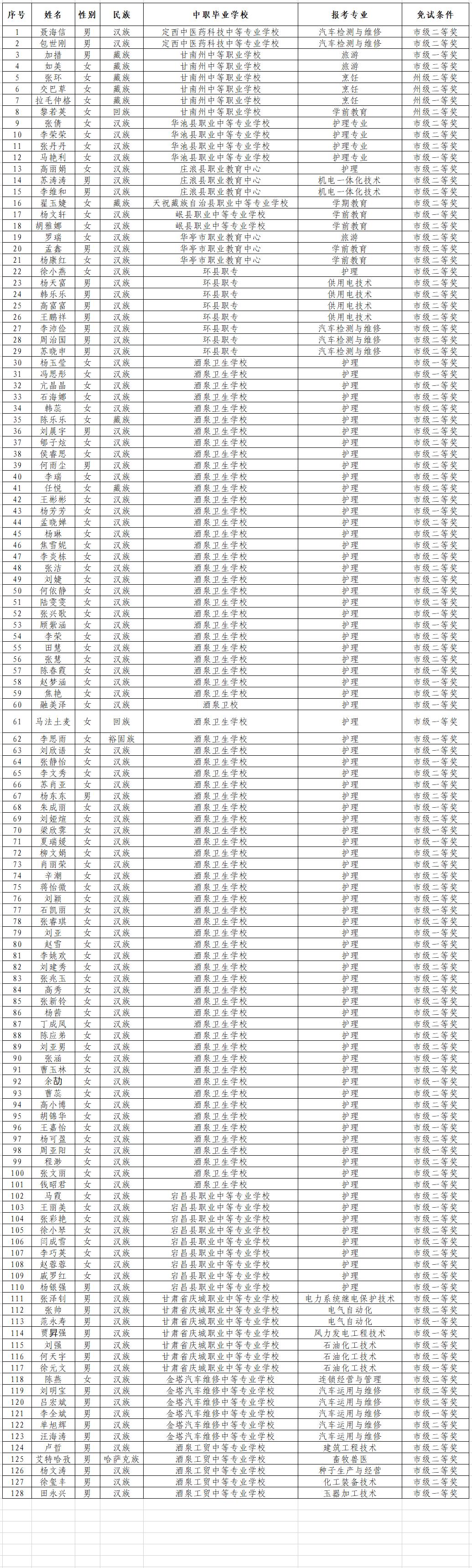 酒泉职业技术学院关于2022年中高职贯通培养转段升学考试免试入学学生的公示