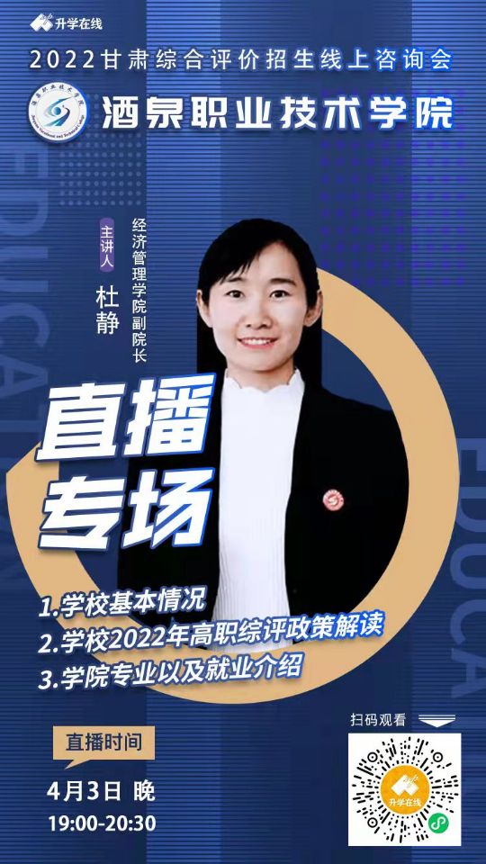 为使广大考生和家长全面了解我省普通高中生综合评价政策,搭建学校、考生及家长沟通交流平台。根据目前疫情防控要求及工作实际,我校联合“升学在线”将于4月3日晚19:00至20:30在线开展“2022年甘肃省综合评价线上咨询会”,欢迎广大考生及家长扫码观看。