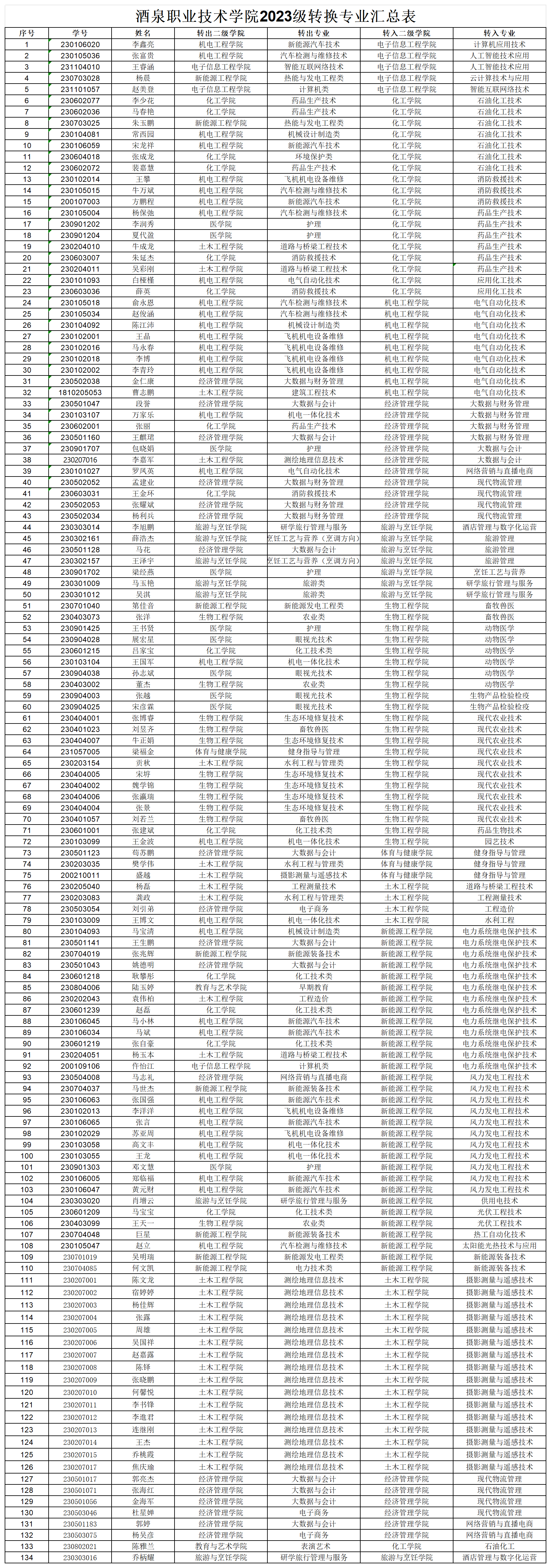 根据《酒泉职业技术学院学籍学历管理办法》和《关于做好2023级学生转换专业及专业分流的通知》相关规定,学校2023级学生申请转专业共计141人,经过、学生本人提出申请、学校考核等环节,最终确定李鑫亮等134名同学转入新专业学习,王振义等1496名同学进行专业分流,现予以公示。若有异议,请在公示期内向相应部门反映。