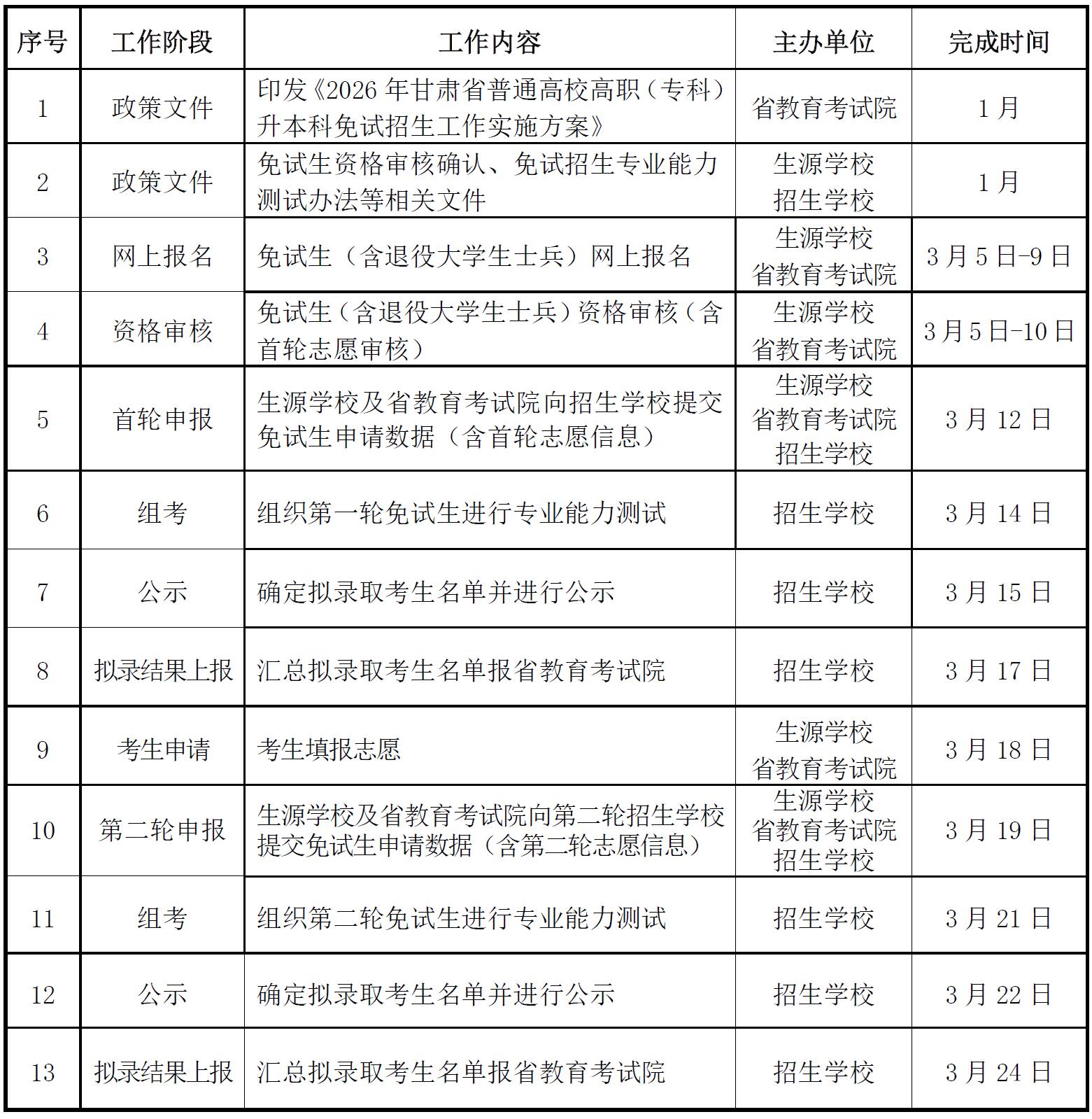 2026年甘肃省普通高校高职(专科)升本科免试招生工作进程表